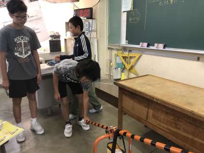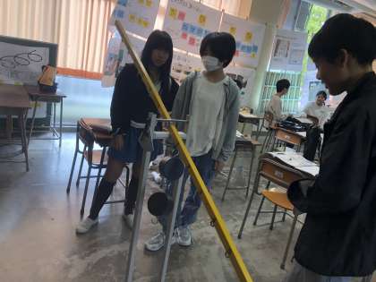 「おもりを付ける場所を変えたら、手応はどうなるかな?」「どこに力をかけたら小さい力で持ち上げる事ができるかな?」と試行錯誤しながら、軽く持ち上げる方法を模索しました。