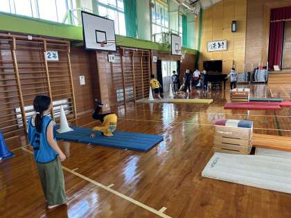 今日は、運動係の企画した障害物競走とリレーを行いました。体育館を活かしたイベントにみんな楽しんでいました。