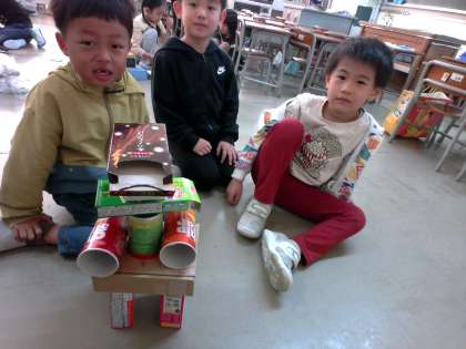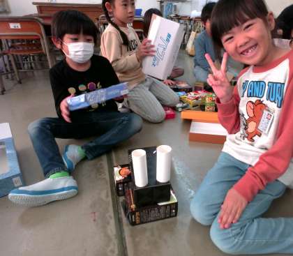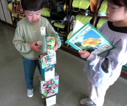 算数科の学習で、いろいろな箱を使ってかたちあそびをしました。何をつくるか考え積み重ねたり、たまたまできた形を楽しんだりしていました。