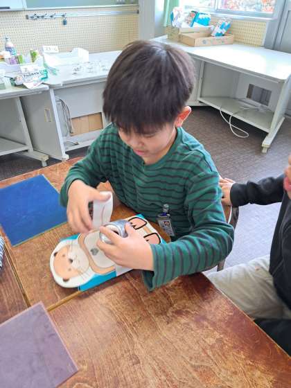 「電気を通すもの」を調べる実験を通して、電気を通すはずの金属でできた空き缶(スチール缶やアルミ缶)が電気を通さなかったという結果から、「どうしたら空き缶は電気を通すのだろう」という問いをもった子供たち。「塗ってあるもの(塗装)を取れば電気を通すだろう」という仮説を立てて、実験で確かめました。「光った!」という驚きや喜びの表情が印象的でした。