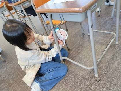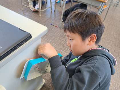 「机の脚は色が塗られているから、剥げているところをつないだら電気が通りそう」「窓の枠はアルミだから通すかな」と自分なりに見通しをもって活動していました。