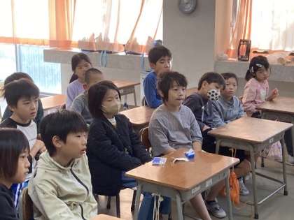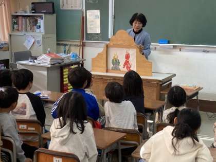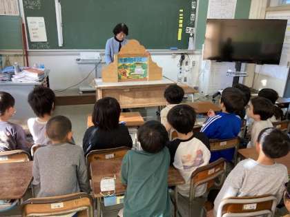 紙芝居「七曲がりのきつね」とキリンに関する詩と書籍の読み聞かせをしていただきました。子供たちは、お話の世界に入り込み、真剣に聞きました。