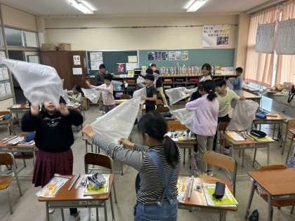閉じ込めた空気について学習しました。押すと固く感じる、空気鉄砲の音が違うなど、五感をはたらかせながら学習に取り組みました。