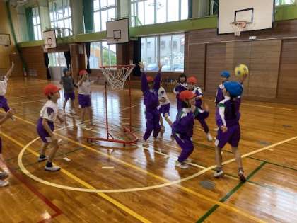 ボールを使ったゲームに挑戦。中央のかごにボールを入れるチーム、それを阻止するチーム。3分の交代制でゲームをしました。