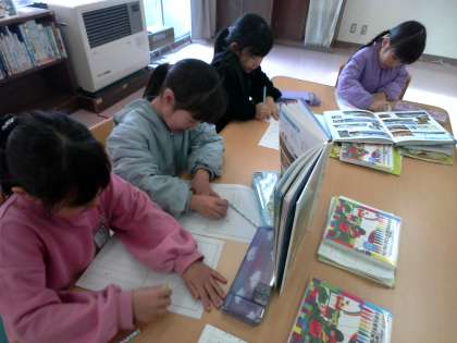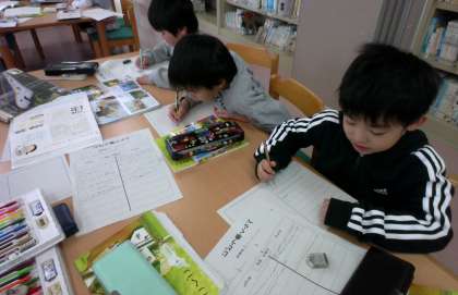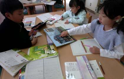 国語科の学習で、じどう車ずかんをつくりました。自分が選んだ車の仕事やつくりを調べ、絵や文で表しました。友達と一緒に図鑑を見ながら楽しく活動していました。