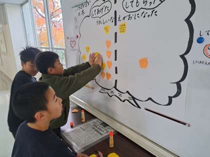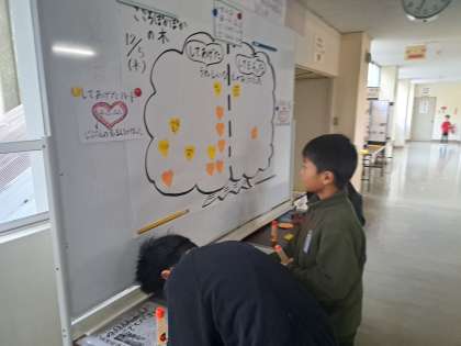 友達にしてもらってうれしかったこと、周りの人のために何かしてあげられたことを書いて、温かい気持ちでいっぱいの木にしようと取り組んでいます。