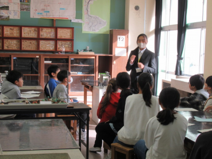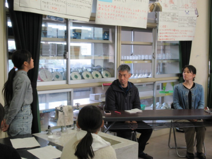 立山カルデラ砂防博物館の学芸員の先生方と常願寺川を一緒に実地見学した国立立山青少年自然の家の先生を招いて、50年後も川の水による災害を防ぐ「わたしたちの常願寺川水害防止ジオラマ」を提案発表しました。これまでの主体的な学びをたくさんほめて頂くと共に、この学びを生かすことの大切さを教えて頂きました。「これからも学び続ける」という新たな目標を見付けた子供たちでした。