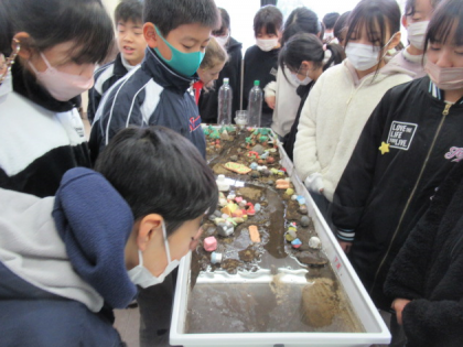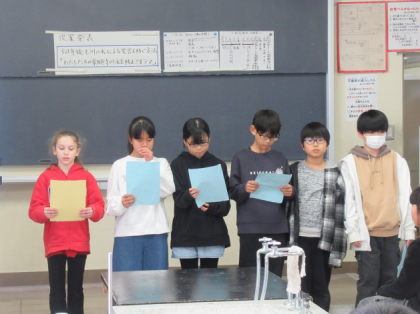 立山カルデラ砂防博物館の学芸員の先生方と常願寺川を一緒に実地見学した国立立山青少年自然の家の先生を招いて、50年後も川の水による災害を防ぐ「わたしたちの常願寺川水害防止ジオラマ」を提案発表しました。これまでの主体的な学びをたくさんほめて頂くと共に、この学びを生かすことの大切さを教えて頂きました。「これからも学び続ける」という新たな目標を見付けた子供たちでした。