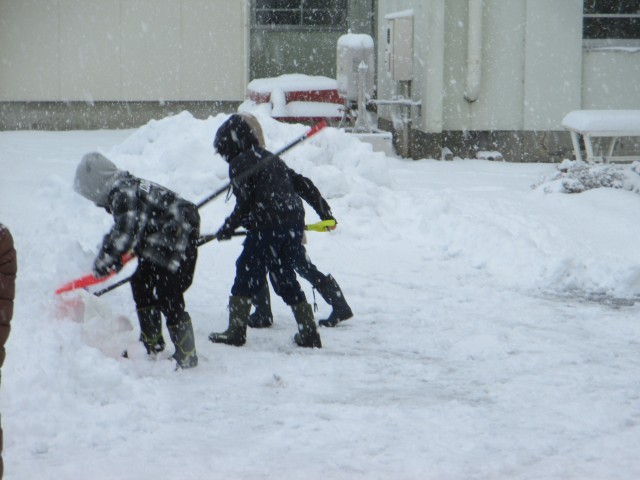 雪が降りました。朝登校した人から、給食を運搬するトラックが入りやすいように雪かきをしました。一生懸命雪をかく姿が頼もしかったです。