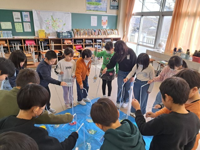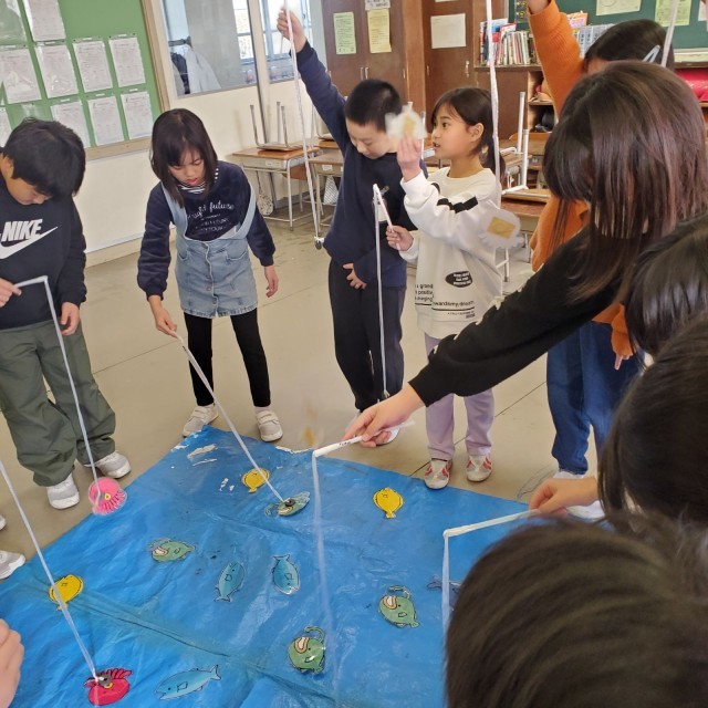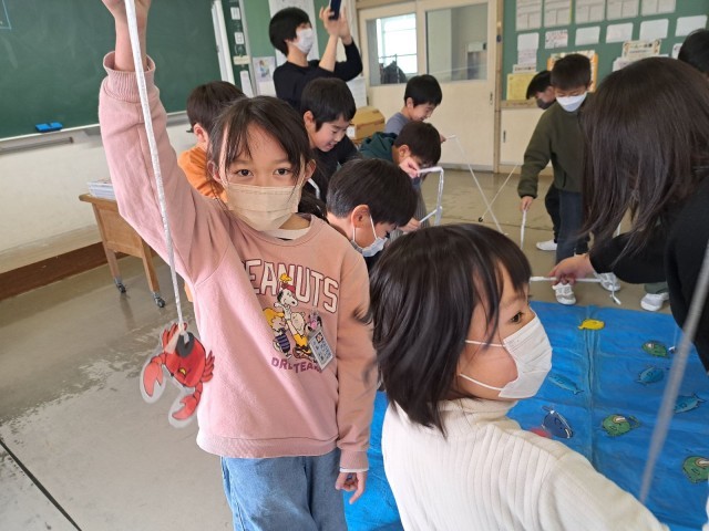 魚釣りゲームでは、じしゃくのついた釣り竿を使って「やった!釣れた!」「チョウチンアンコウはどうしても釣れないな」と魚の裏面に貼り付けてある物の素材によって、じしゃくにつくものとつかないものがあることを確認しました。