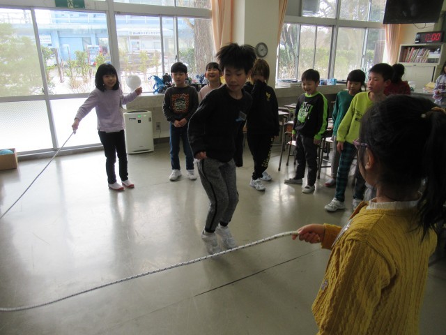 休み時間もみんなでなかよく大なわで遊んでいます。
