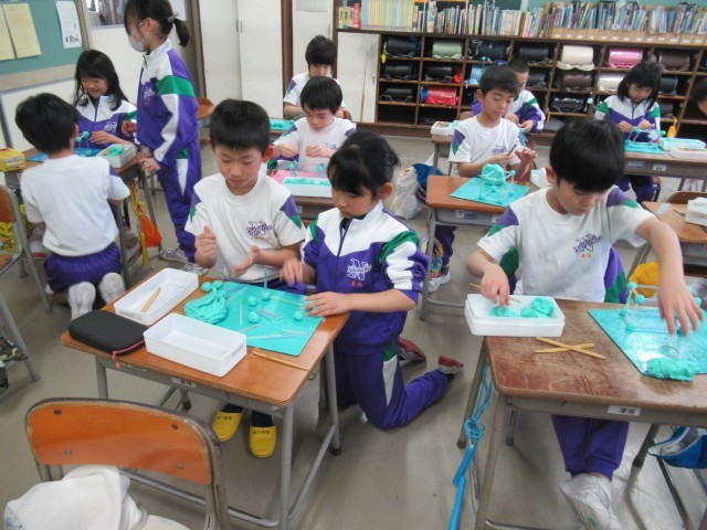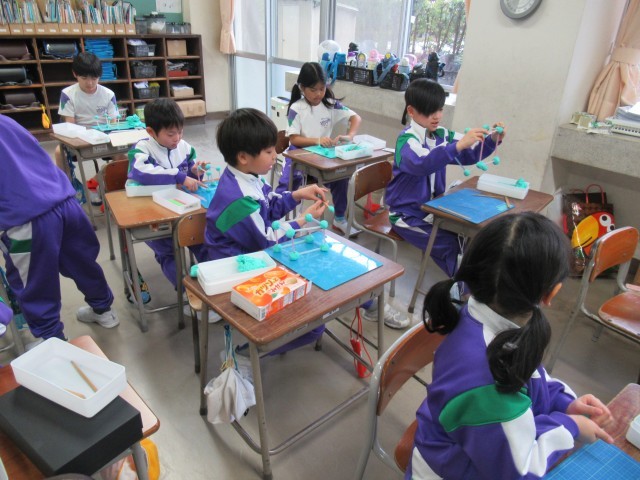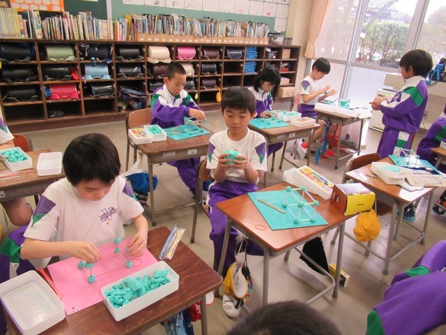 今日は、粘土を頂点に、ストローを辺に見立てて、箱(直方体)づくりに挑戦しました。