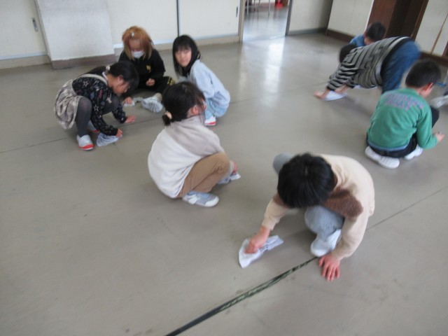 床を何回も水拭きし、自分たちで汚れているところを見付け、進んできれいにしました。