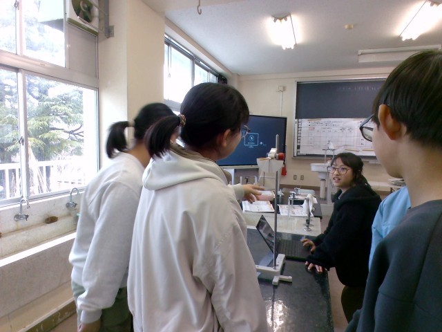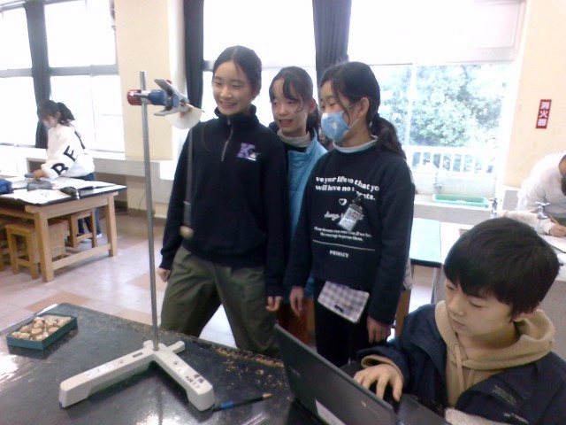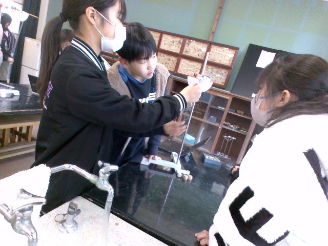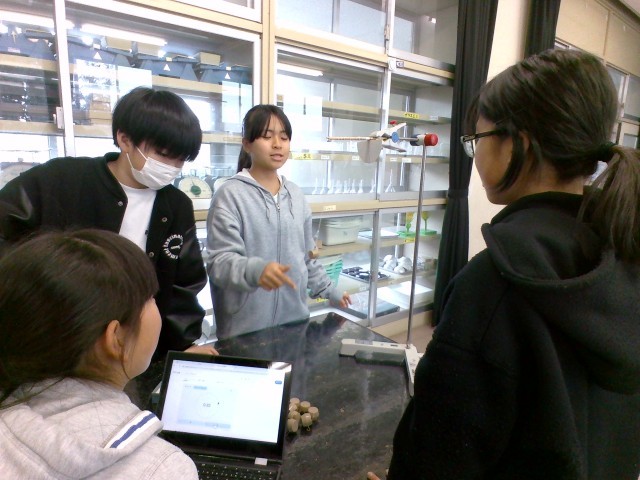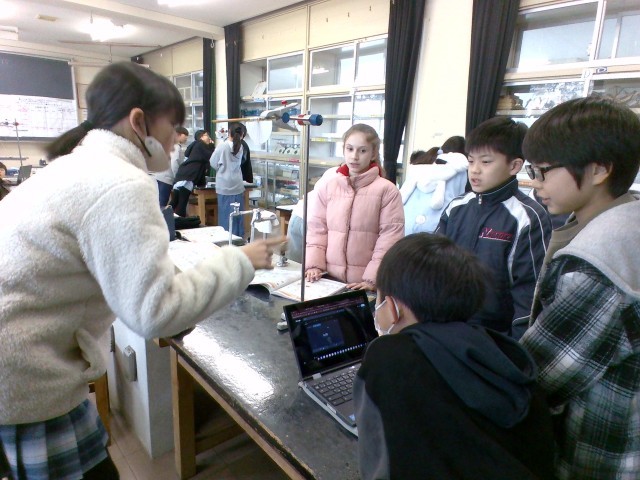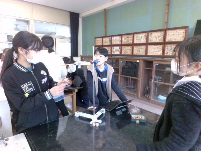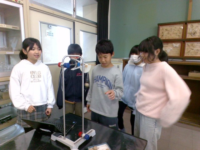 「ふりこの長さ」、「おもりの重さ」、「ふれはば」の条件を変えて、ふりこの一往復する時間を調べています。予想では、「ふりこの長さ」が変わると一往復する時間が変わるという人が一番多かったですが、「おもりの重さ」や「ふれはば」でも変わると考えている人もいました。実験で検証している子供たちです。