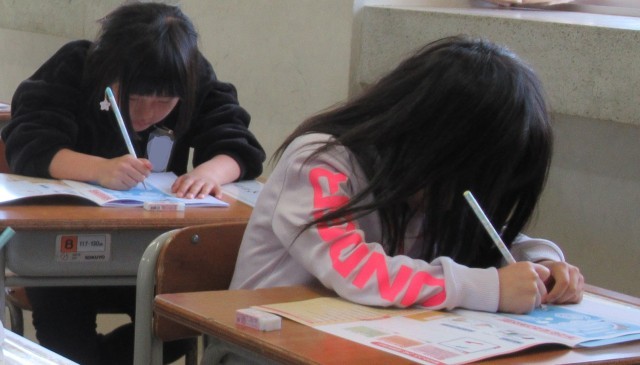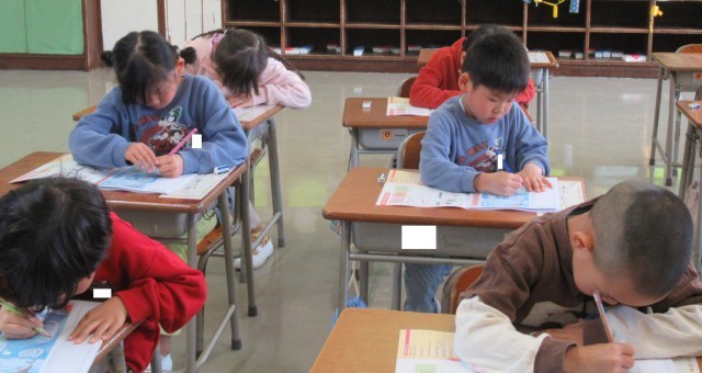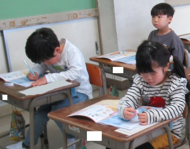 国語科の学習が始まりました。鉛筆を正しく持つ練習をしたあとに、直線や曲線を書く練習をしました。どの子も鉛筆の持ち方に気をつけて学習に取り組みました。