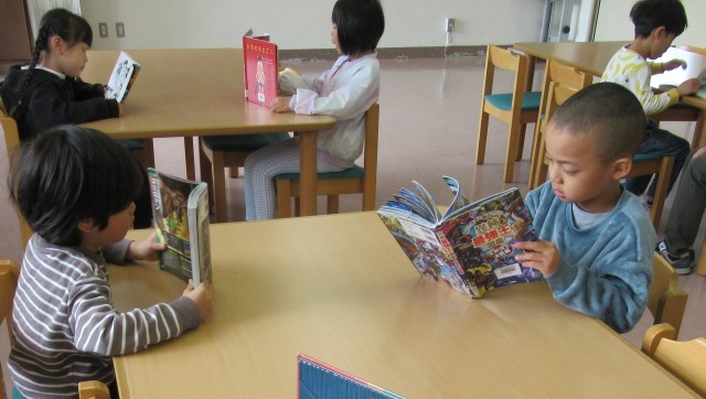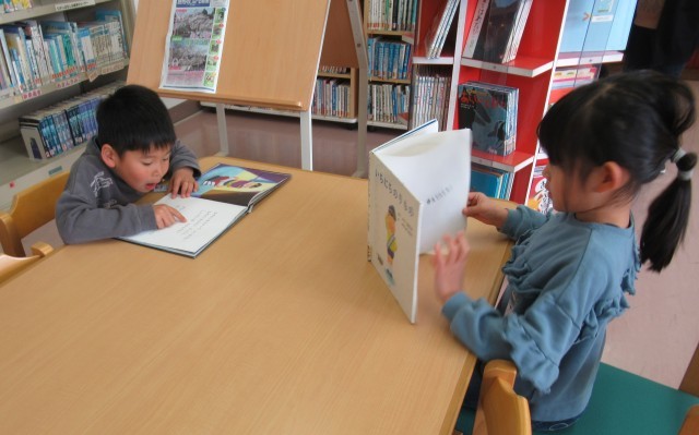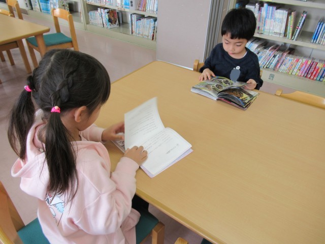 初めて図書室に行きました。絵本や図鑑など、いろいろなジャンルの本に親しみました。