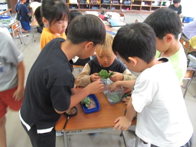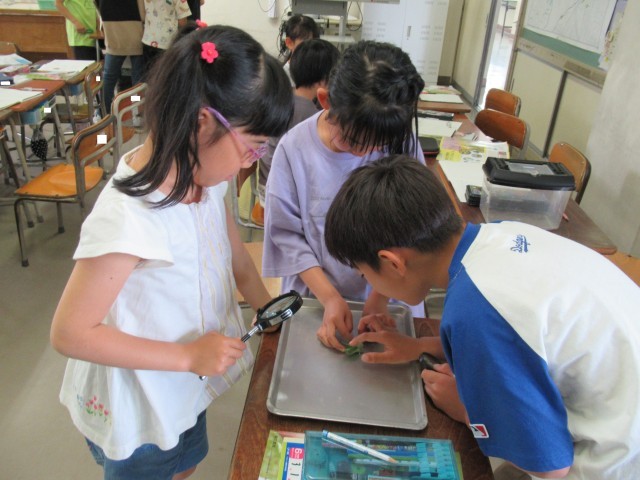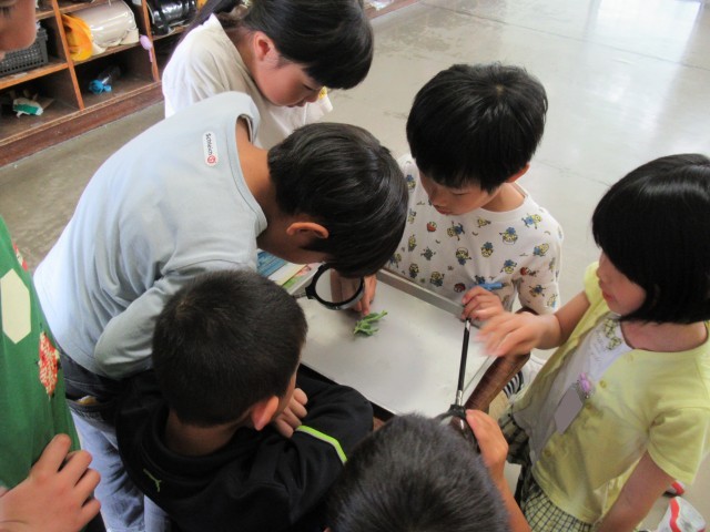 子供たちが見付けてきたチョウのたまごや幼虫を観察しました。数日で大きく成長していることに驚いていました。