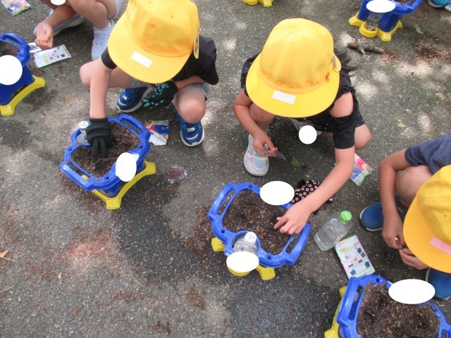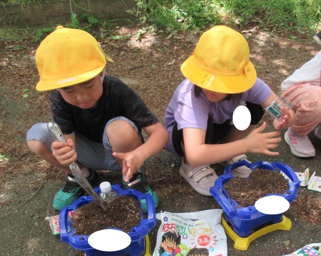 あさがおの種を植えました。土に肥料を混ぜたり種をなくさないように大事に植えたりしました。成長が楽しみです。