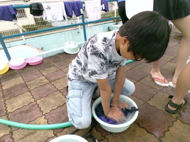 プール清掃の後、清掃で汚れた水着や体そう服を手洗いしました。すすぐことや、しぼることに四苦八苦しながらも、自分で洗って干すことができました。太陽のもとプールサイドに並べて干すと、帰る頃には随分乾いていました。自分で洗った達成感を感じたり、お家の方が毎回洗濯してくれていることに感謝の気持ちをもったりした子供たちでした。
