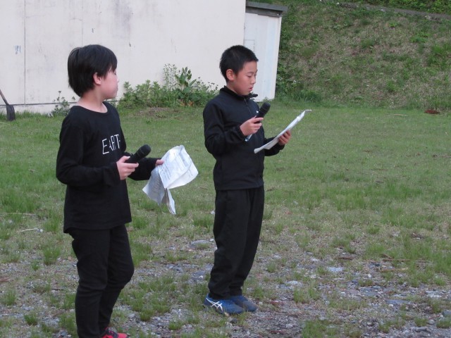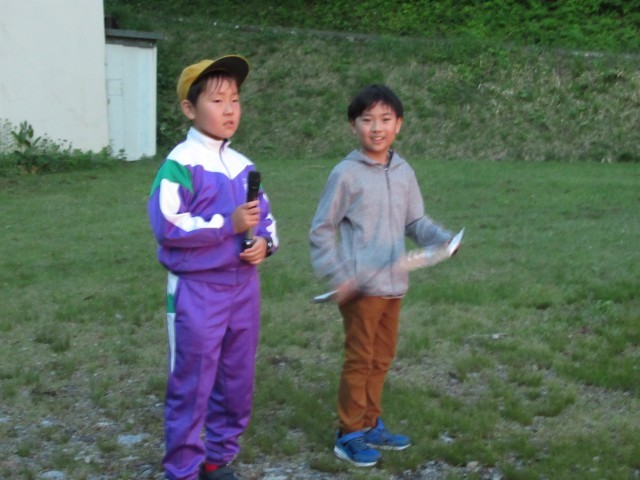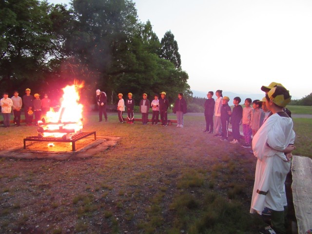 キャンプファイヤーを行いました。だんだん日が暮れて暗くなる中、子供たちが司会進行しながら、活動することができました。