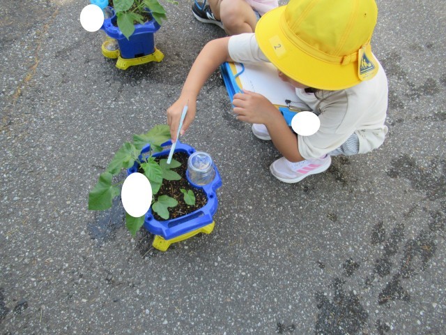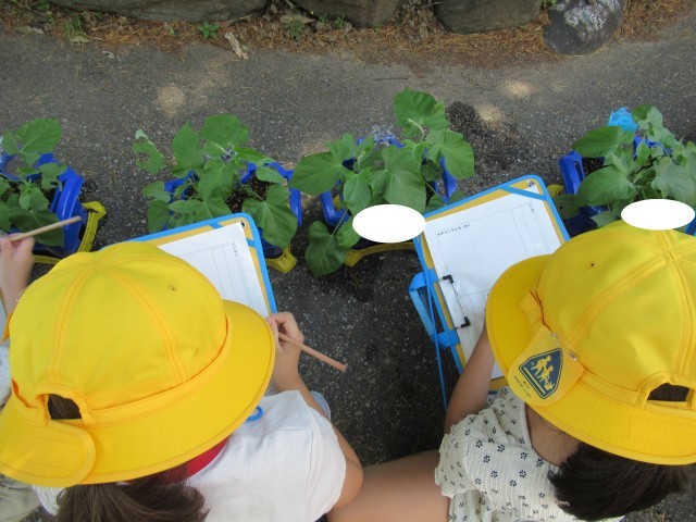 5月に植えたあさがおは、どんどん大きくなってきました。葉の数が少しずつ増えていき、子どもたちは成長を喜んでいます。