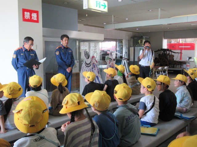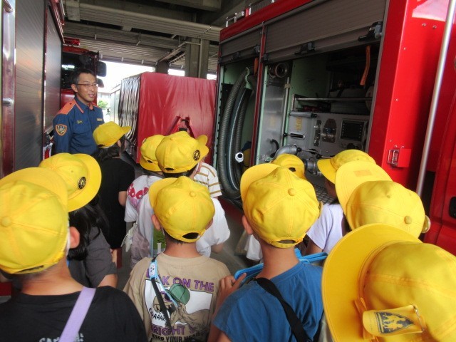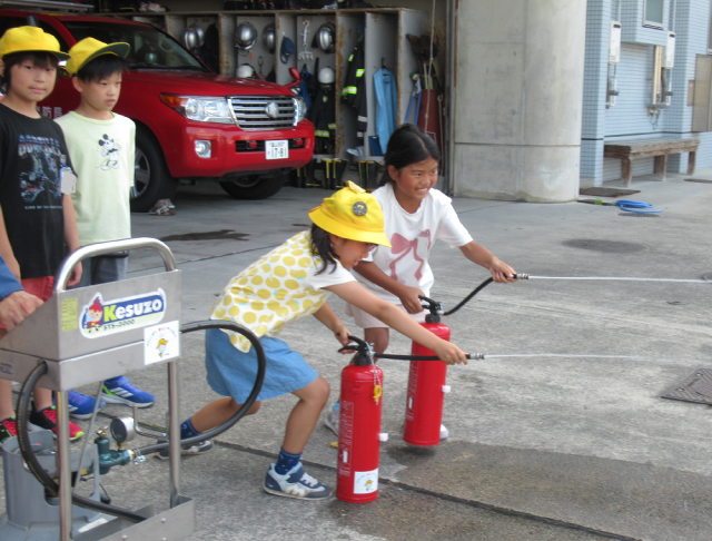 午後の消防署の見学では、見学だけでなく、緊急の際の電話のかけ方・消火体験をさせていただきました。