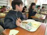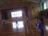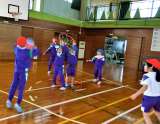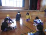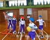 体育館の2年生。バスケットボールのゴールを低くしたようなボールゲームを楽しんで...
