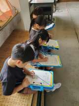 探検で見つけたことはワークシートにどんどん書き込んでいきます。習いたての文字を使...