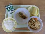 今日の献立は、ごはん、牛乳、揚げ魚のレモン味、親子煮、バナナです。ごちそうさま...