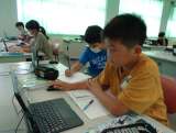 コンピュータ室の6年生。国語科の学習として提案する文書をつくるために、情報収集...