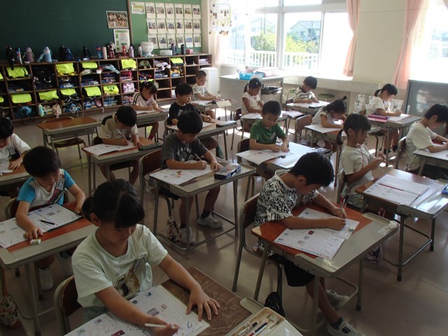 2学期が始まったばかりですが、子供たちは、よい姿勢でかたかなの学習に取り組んでいました。少しずつ、学校の生活リズムに心と体を慣らしていってほしいと思います。