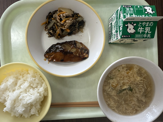 今日の給食は、ふくらぎの照り焼き、もずくのチャプチェ、中華かき玉汁、ご飯、牛乳です。