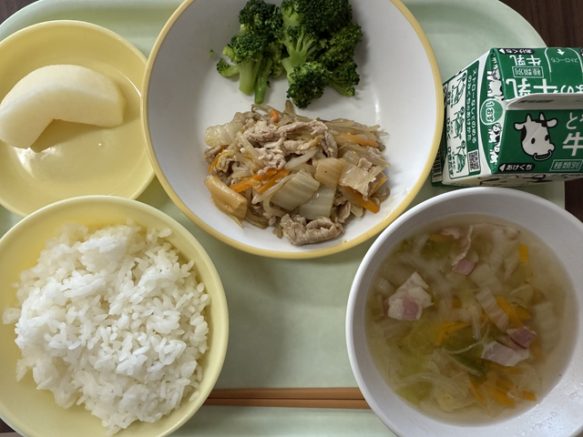 今日の給食は、豚キムチ丼、白菜スープ、茹でブロッコリー、梨、牛乳です。