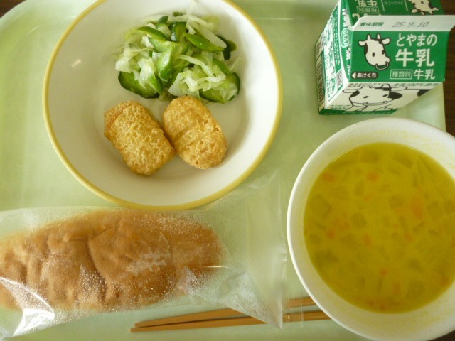 今日の給食は、かぼちゃポタージュ、チキンナゲット、グリーンサラダ、コッペパン、牛乳です。