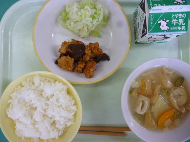 今日の給食は、鶏肉とレバーのあまからめ、五目みそ汁、そえ野菜、ご飯、牛乳です。