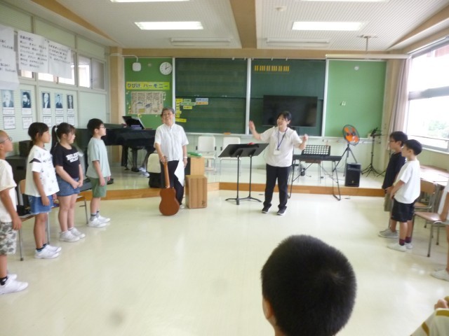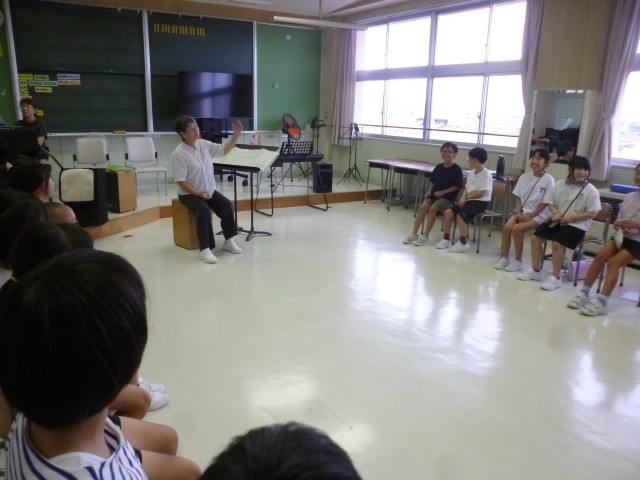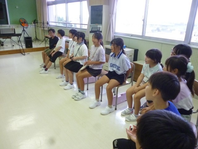 学習発表会に向けて練習を頑張っていますが、今日は特別に外部講師をお招きして指導していただきました。「さあさあ始めましょう。楽しい音楽を~」という歌に始まり、みんな大きな輪になって歌いました。笑顔で会話を楽しみながら、リラックスした雰囲気の中で、音楽の大切なことをたくさん教えていただきました。合唱の中では、立ち方、歌いだしの呼吸の仕方、口の開け方、曲調の変化を感じ取った歌い方など、歌う中で自然とポイントがつかめるように指導していただきました。合奏でも主旋律を演奏敷いているのはどの楽器なのか考えながら、強弱をつけるだけでもずいぶんバランスがよくなりました。教えていただいたことを明日からの練習にも生かしていただきたいです。次回の指導もとても楽しみですね。
