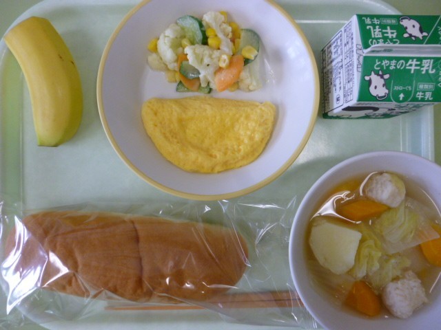 今日の給食は、チーズオムレツ、野菜のスープ煮、カラフルサラダ、バナナ、コッペパン、牛乳です。
