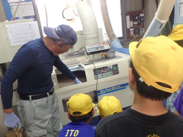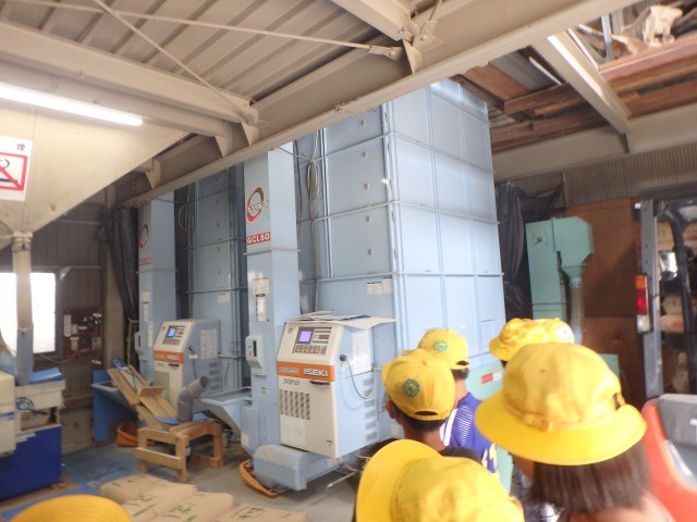総合的な学習の時間で、地域の方のお宅に伺い籾摺りの様子を見学させてもらいました。大きな機械がたくさんあり、機械の大きな音に驚きながらも米づくりの大変さを見て学ぶことができました。