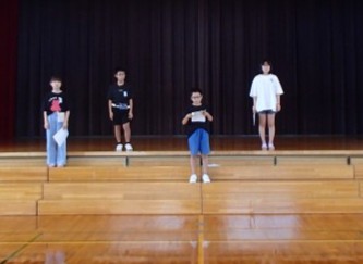 今週に体育館での練習を始めました。立ち位置、声の大きさ、振りつけについて、体育館ではどのように見えるかを考えながら練習に取り組んでいます。「どんな言い方をしたらいいかな」「この場面では振りつけをどうしたらいいかな」と友達と相談したり、一人で考えたりしながら、どの子もよりよい発表にしようとがんばっています。保護者の皆様、ぜひ励ましの言葉がけをよろしくお願いします。