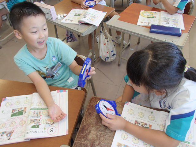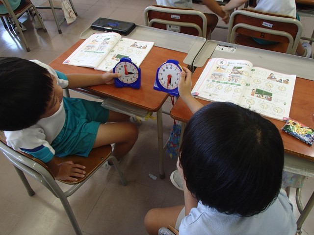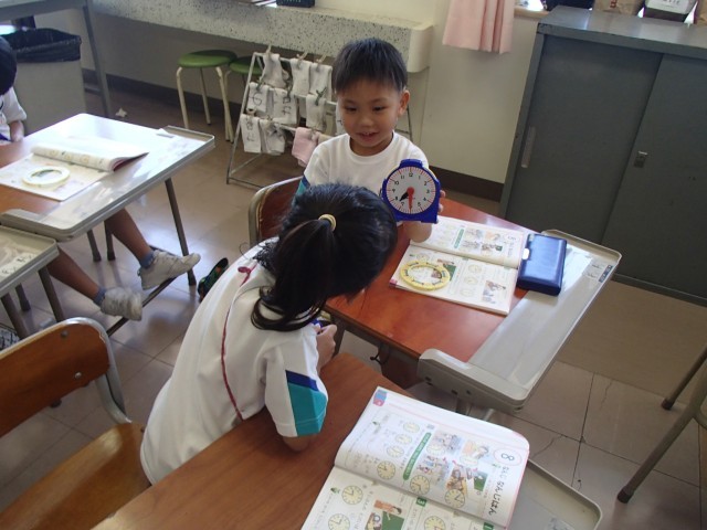 算数科で時計の学習が始まりました。「なんじ」「なんじはん」という時刻について、友達と問題を出し合いながら理解を深めました。