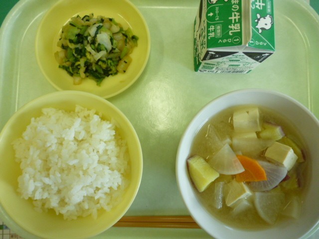 今日の給食は、さつま汁、白菜ひたし、ご飯、牛乳です。