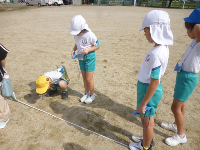 今日は気持ちのよく晴れたので、理科の時間に太陽を観察をしました。遮光版を使って初めて太陽を見た子供たちは、「すごい!」と歓声をあげ、お月さまみたいだな、青色に見えるなど思ったことを口にして、とても楽しそうでした。そのあとは影をつないだり、影の長さを測ったりしながら、太陽と影について興味をもったことを試していました。晴れた日にまた太陽とかげを観察しながら学習を進めていきます。