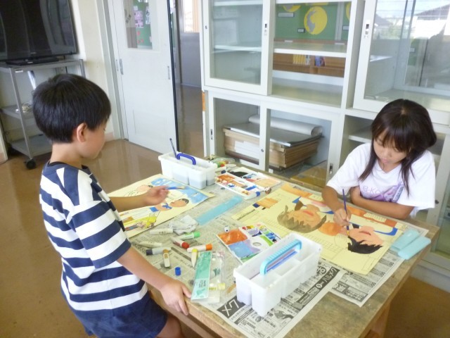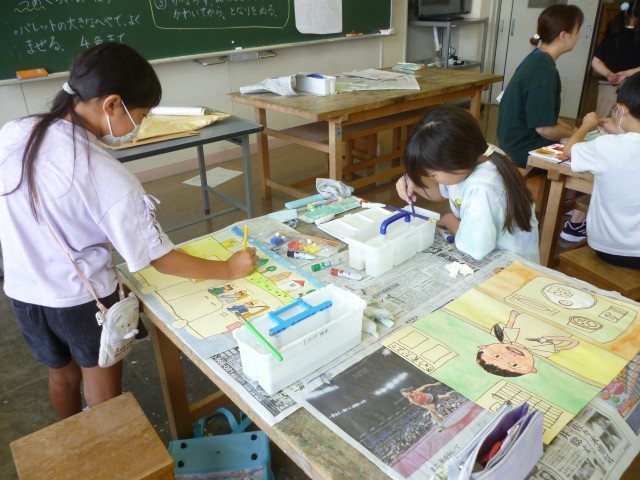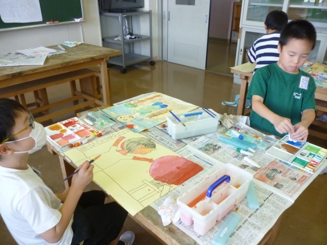 学習発表会「みんなにありがとう~感謝の花、笑顔の花を届けよう~」という発表に関連して、図工でも感謝の気持ちを伝えたい場面を絵で表現しています。楽しかった思い出や頑張っている自分、家族が作ってくれたご飯をおいしく食べている自分など、思いは様々です。大きく構図を描き、色づくりや塗り方にもこだわって丁寧に作品を描いています。