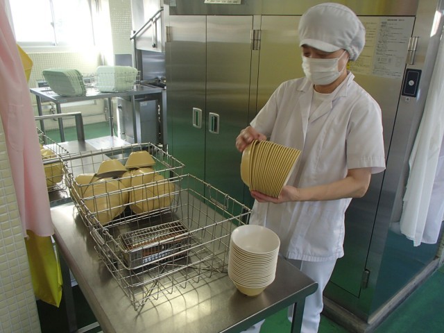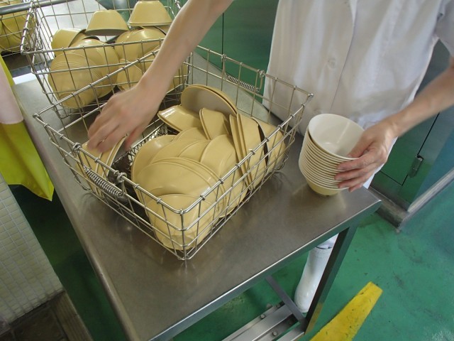 次は、給食後です。運搬車を回収した後、使用済みの食器を洗浄機で洗浄します。その後、洗い残しや食器の破損がないかを確認するために、一つ一つの食器を手に取って調べます。問題がなければ乾燥庫に入れ、高温で乾燥させ、翌日の給食まで安全に保管します。