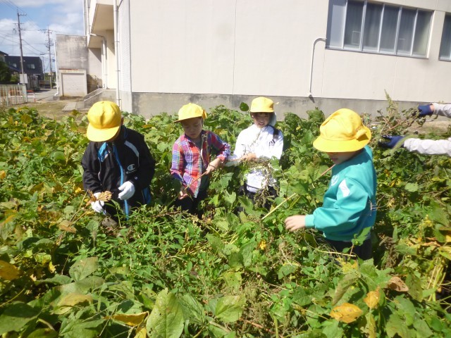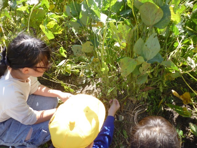 今日は以前から気になっていた畑の草むしりをしました。畑の中にどんどん分け入って、大豆以上に大きくなっている草をむしる子、取った草を運ぶ子など、みんなで自然と手分けをしてやっていました。子供たちの協力で畑があっという間にすっきりと大豆だけに。最後に茶色くなった大豆のさやを取り、カラカラ音が鳴るか、耳で確かめてから中を開いてみると、中からきれいな大豆が出てきて、歓声が上がりました。ごほうびに少しだけ枝豆をゆでて食べてみましたが、みんなとってもおいしそうに食べていました。