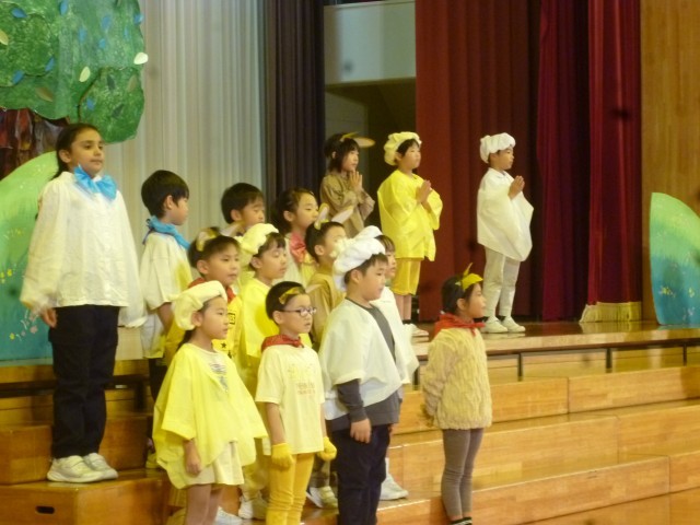 子供たちは、一ヵ月の練習の成果をすべて出し、素敵な劇を発表することができました。子供たちからは、緊張の様子も見られましたが、劇が終わったあとには、「楽しかった!」という声もありました。今後も、1・2年生の団結力が楽しみです。