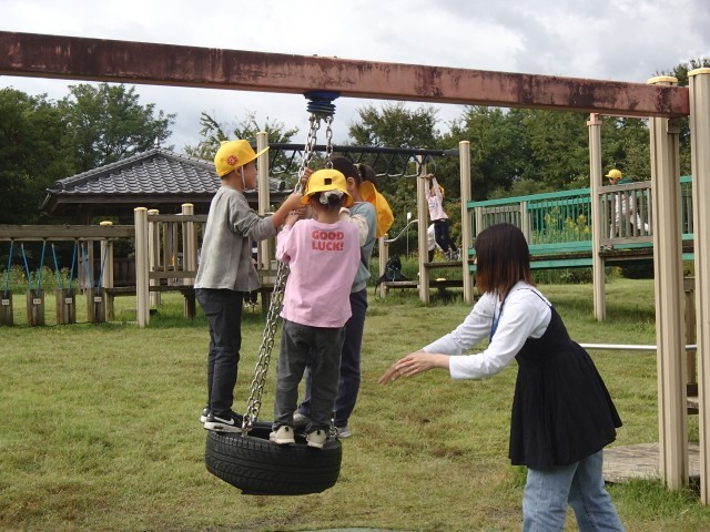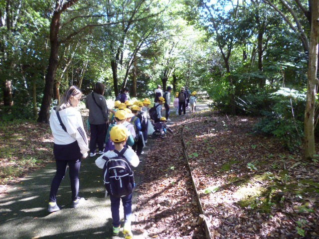 路線バスに乗って北代緑地に移動し、秋見つけや遊具での遊びを行う活動の中で、子供たちの安全管理のために1年生保護者の皆さんを対象に募集したものです。すぐに多くの方が快く手を挙げてくださり、教員は安心して引率・指導することができました。
