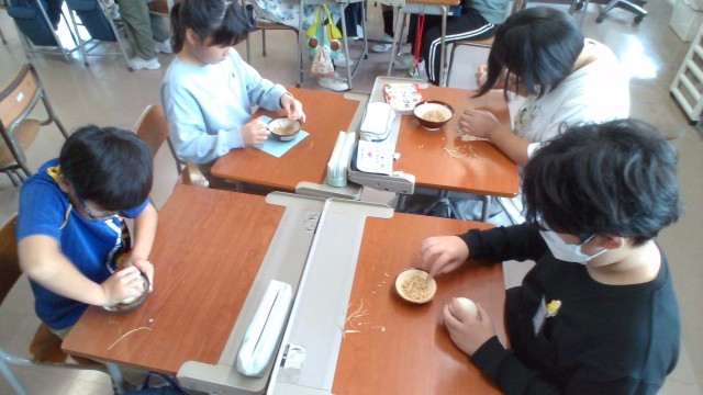 9月に稲刈りで収穫したもち米の籾摺りを行いました。一生懸命がんばったものの一握り程しか籾が擦れず、6年生によりよい方法を聞こうと考えている子供たちでした。