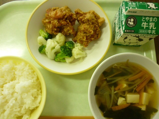 今日の給食は、鶏肉のごま揚げ、花野菜サラダ、わかめスープ、ご飯、牛乳です。