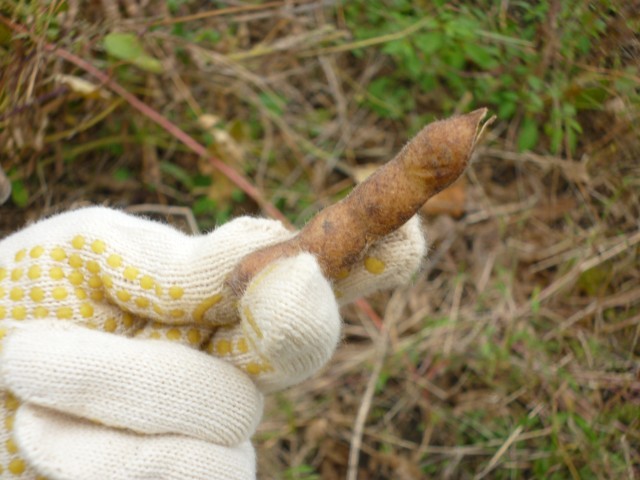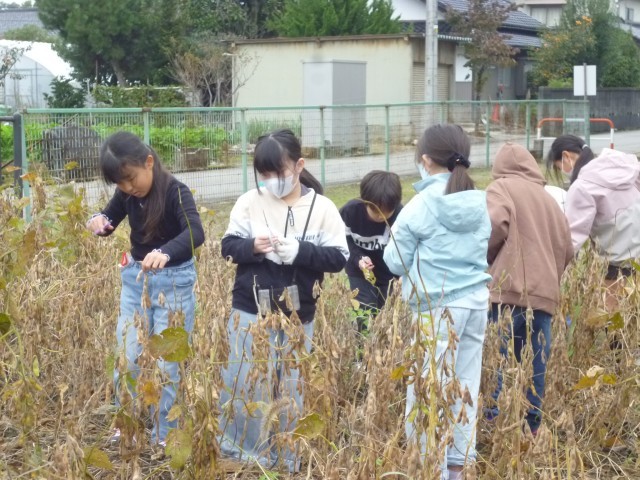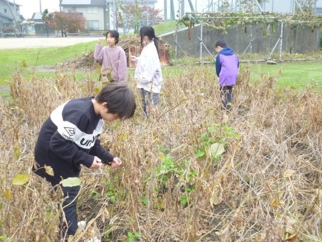 10月31日(金)総合的な学習の時間に、今まで育ててきた大豆の収穫をしました。大豆になっているかどうか見極めるポイントはさやの色と振ってカラカラ音が鳴るかです。子供たちははさみを持って大豆畑に入り、大豆の品定め。カラカラ鳴るか確かめながら、みんなでどんどん収穫していきました。さやの大きさもいろいろありますが、中には4つも豆が入っているものもありました。